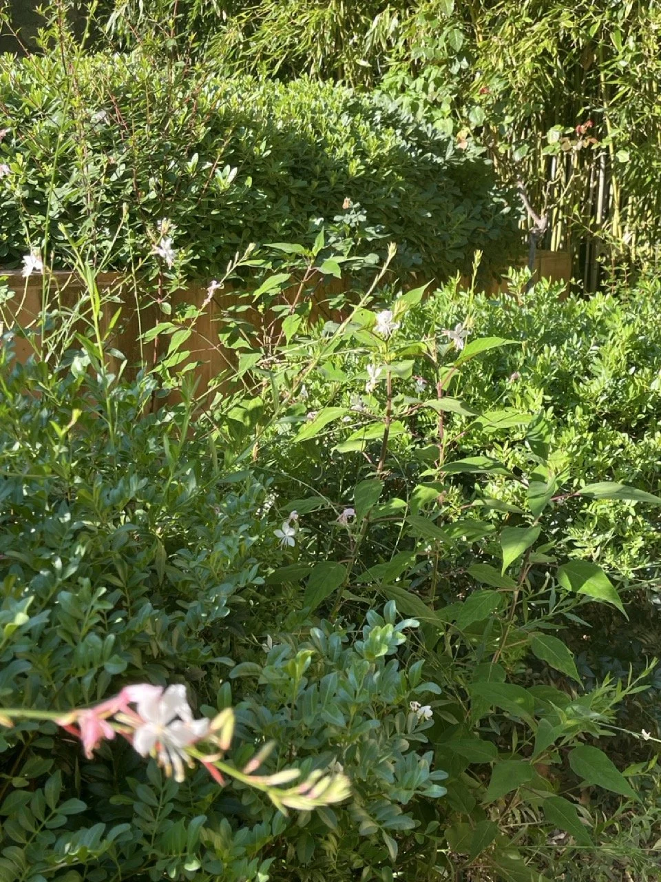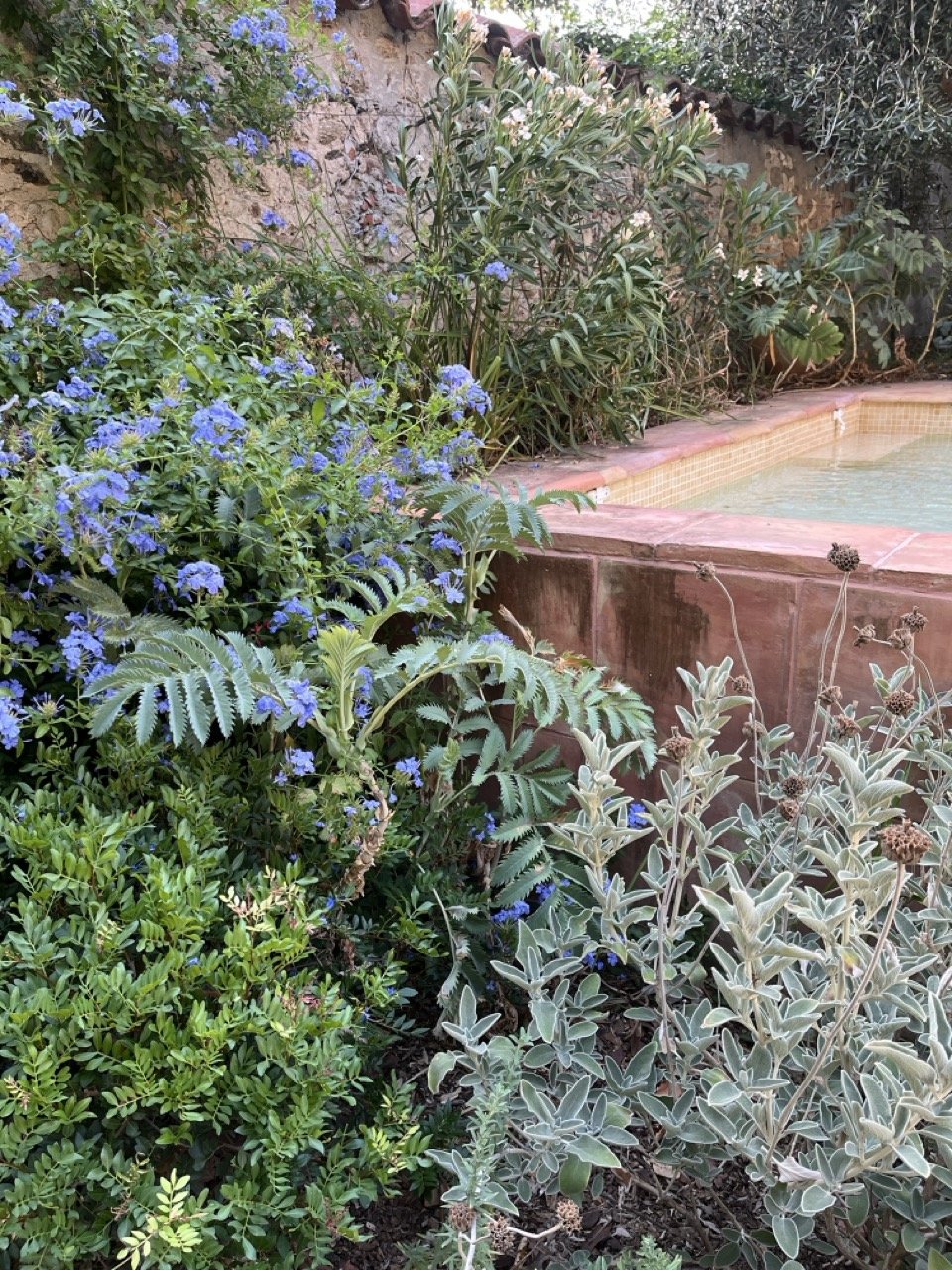 Pistachiers, romarins et pittospores assurent une structure forte et persistante tout au long de l’année. De nombreuses vivaces et rosiers viennent ponctuer les saisons de leurs feuillages et floraison.